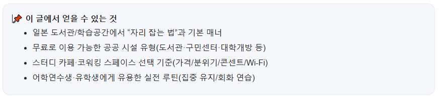 일본 생활에서 공부가 늘어지는 가장 큰 이유는 환경이 계속 바뀌고 흐트러지기 때문이에요. 도서관/스터디 장소를 한두 군데 “고정 루틴”으로 만들어두면, 같은 시간을 투자해도 성과가 달라집니다.