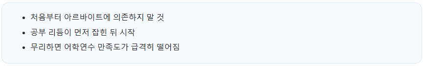 👉 일본 어학연수 생활비 현실 정리 글에서 월 평균 비용을 먼저 확인해보는 것이 좋습니다. - 실제로 아르바이트에 지나치게 의존하다가 어학연수에 실패하는 경우도 적지 않으니,